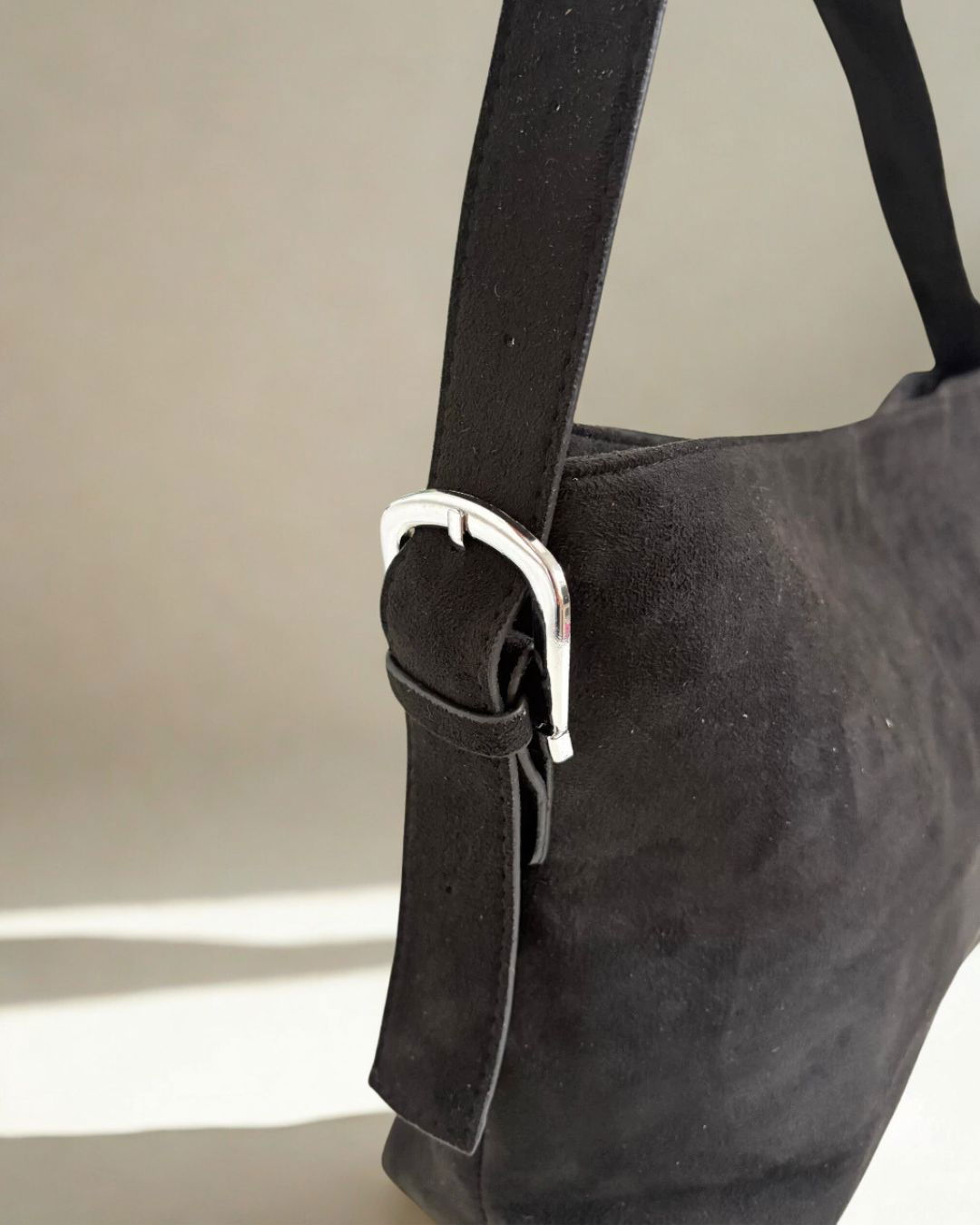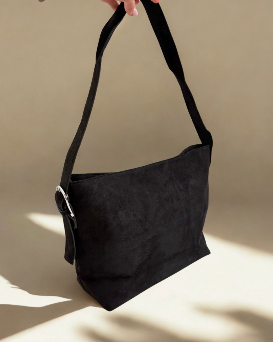 La correa regulable con hebilla permite ajustarla a tu medida y llevarla al hombro con total comodidad. La textura gamuzada le aporta un toque cálido, sofisticado y muy versátil.