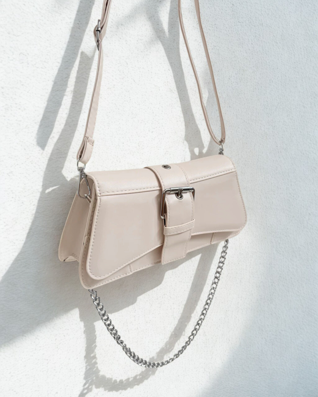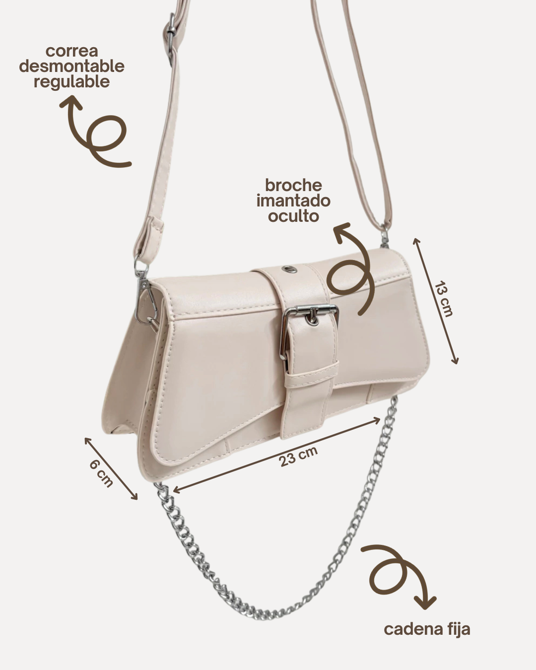 Incluye doble correa para usarla como quieras: una cadena corta fija para llevarla al hombro y una correa larga regulable y desmontable, del mismo material y color que la bag, perfecta para usarla cruzada.